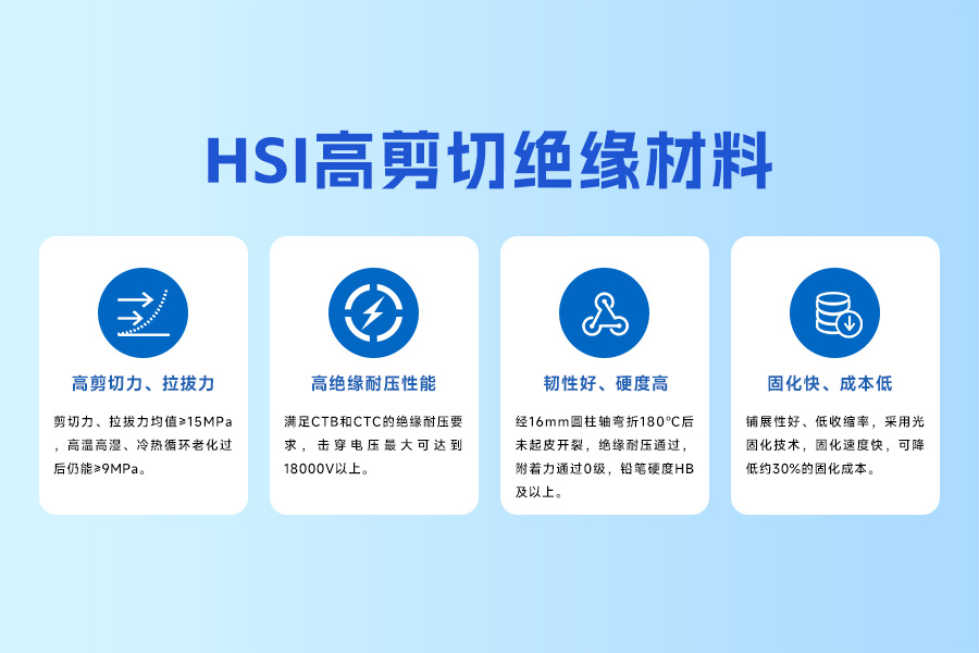 HSI 高剪切绝缘材料 HSI 高剪切绝缘材料是一款专用于锂电领域金属外壳电池表面绝缘保护的打印材料,具有高剪切力、高附着力、高绝缘耐压、耐弯折、耐摩擦、固化速度快等特点。材料经过多重老化检测,在极端工况中依然保持长时间性能稳定。 优势一:快速固化,适配高速生产 在规模化生产中,时间就是效益。HSI 高剪切绝缘材料凭借独特的配方设计,实现了极秒级固化特性,能大幅缩短涂层固化周期,帮助企业提升产能、降低单位时间成本,为大规模量产提供坚实保障。 优势二:涂层精度高,厚度可自定义调节 不同类型的电芯对绝缘涂层厚度有着差异化需求。HSI 材料通过先进的工艺控制,可实现涂层厚度的精准调控。从微米级打印到特定厚度的定制化涂层,均能保持均匀稳定的打印效果,有效避免因厚度不均导致的局部绝缘失效问题,确保电芯一致性与可靠性。 优势三:绝缘耐压性能优异,保障电池安全 绝缘耐压性能是电芯涂层的核心指标。HSI 材料能在电芯表面形成高效绝缘屏障,彻底阻断微短路风险。即使在长期充放电循环中,也能保持稳定的绝缘性能,为电池安全筑起坚固防线,从源头降低热失控隐患。 优势四:耐电解液及稳定性强,适应 -40℃~200℃ 极端环境 电池在生命周期中需面对复杂工况考验,HSI 材料展现出超强的环境适应性。其特殊分子结构赋予材料优异的耐电解液侵蚀能力,可有效抵抗电解液长期浸泡导致的涂层溶胀或老化。同时,在 -40℃ 的极寒环境到 200℃ 的高温条件下,材料性能始终稳定如一,完美应对高低温循环、冷热冲击等严苛场景。 优势五:良好的附着力、柔韧性及高剪切力 电芯在装配与使用过程中会承受一定机械应力,HSI 材料凭借出色的附着力,能紧密贴合电芯基体,避免涂层脱落。同时,材料具备优异的柔韧性,配合高剪切力特性,有效抵抗摩擦与冲击,确保涂层在电芯全生命周期内的安全性。 优势六:环保性优,符合绿色生产 HSI 高剪切绝缘材料采用环保型原料与无溶剂配方,生产过程中无有害挥发物排放,废弃后可自然降解,全程符合 RoHS、REACH 等国际环保标准。选择 HSI 材料,既能提升产品性能,更能助力企业实现绿色制造转型。 总结 从高效生产到安全保障,从极端环境适应到绿色可持续,HSI 高剪切绝缘材料为电芯绝缘涂层提供了全方位解决方案。无论是动力电池、储能电池,都能满足高端制造需求。选择科雷明斯 HSI 高剪切绝缘材料,让每一颗电芯都兼具安全与效能,为新能源产业高质量发展注入新动能! ...